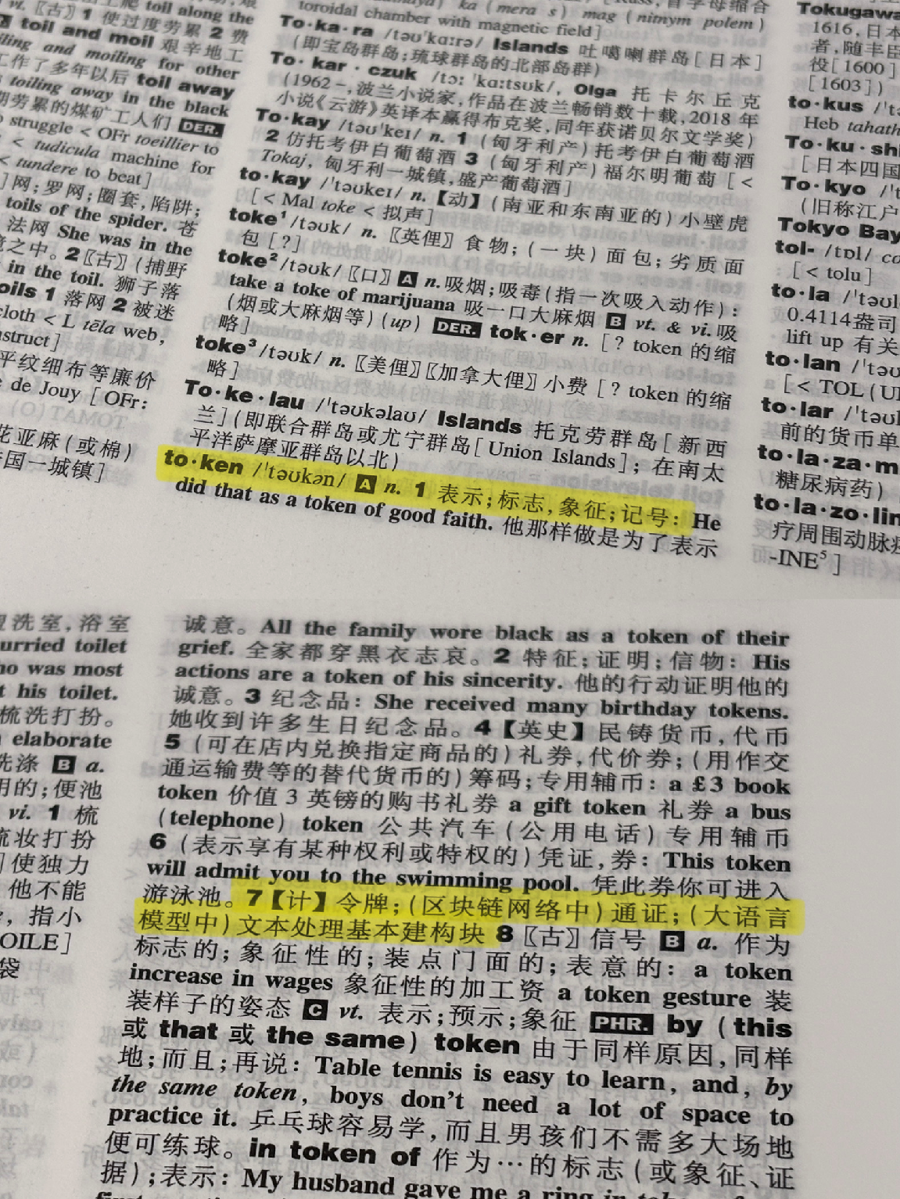与纸质版《英汉大辞书》(第3版)对比,2025年,英汉大辞书编纂处即收录了这一词汇在AI发展语境下的释义:“7.【计】令牌;(区块链汇蚁集)通证;(谎言语模子中)文本贬责基本建构块”,App中则更新为:“7.【计】令牌;(区块链汇蚁集)通证”“8.【计】词元(大模子将数据映射为破碎标志序列的基本单元,是东谈主工智能期间智能开荒中信息存储、贬责和交换的具有一定语义的基本标志单元)”。
