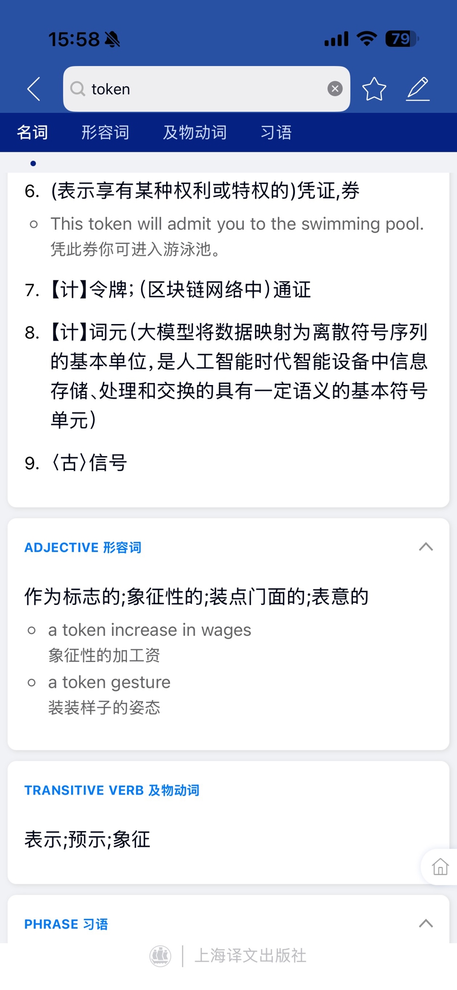 新推出的《英汉大辞书》App能作念到实时更新。比如,token一词的释义已更新加入“词元”这一释义。该释义是宇宙科学技巧名词毅力委员会(宇宙科技名词委)在近期刚刚阐述的程序化汉文命名。