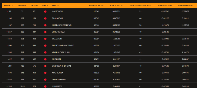 李昊桐和窦泽成齐进入了球员锦标赛。两东说念主同组启程,可惜双双碰到淘汰。他们的宇宙名次齐有一定下滑,以下让咱们来看一下中国名次前十选手以及他们的宇宙名次升跌: