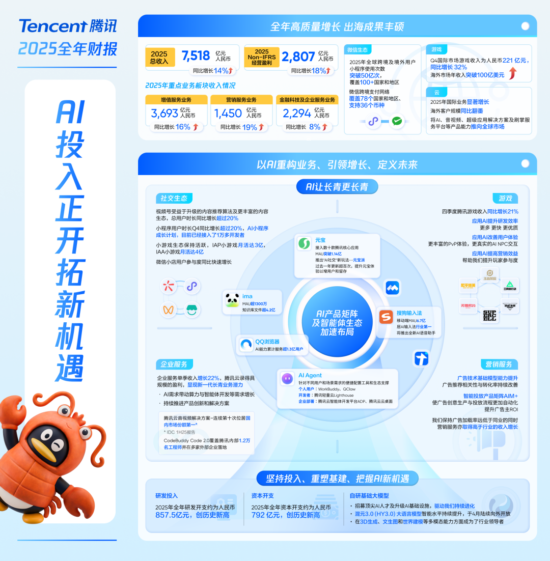 在这次事迹疏通会上,马化腾重心解读了“龙虾”类期骗的中枢上风。他暗意,“龙虾”类期骗的推出,让AI从传统的对话、代码场景,蔓延到与PC环境、任务进程深度交融的新式去中心化进口,这一变化让AI得以落地到更多丰富场景,而非此前聚合在聊天机器东说念主鸿沟,得以充分开释腾讯在PC端和腾讯云的各样产物才气,整合产物矩阵上风,为腾讯拓展了更多可发力的业务阵线。