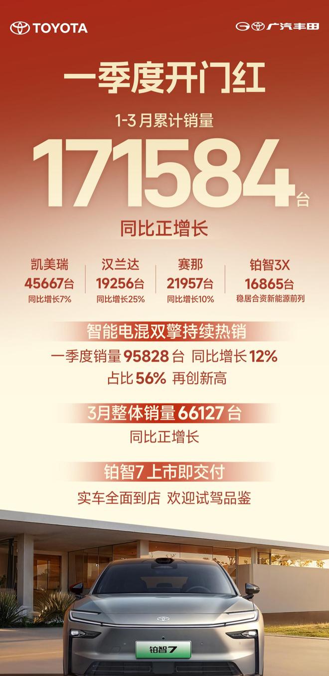 IT之家 4 月 1 日音讯,广汽丰田本日官宣,一季度销量 171584 辆,3 月销量 66127 辆,月度季度双双同比正增长。IT之家附各车型销量: