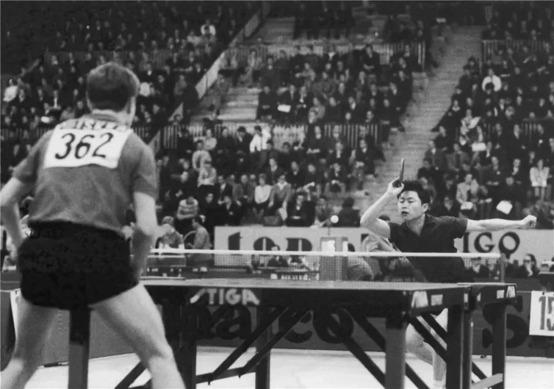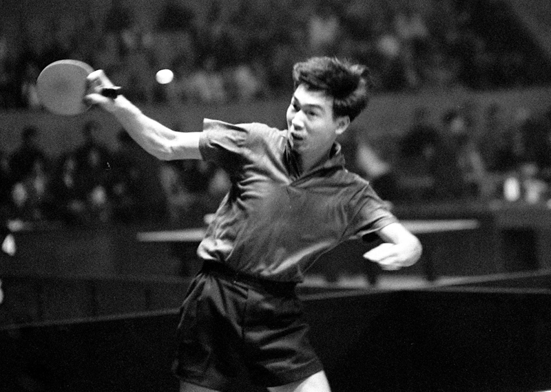 这是1961年4月11日,中国选手张燮林在第26届寰宇乒乓球锦标赛单项比赛中。\n 新华社记者 邹健东 摄