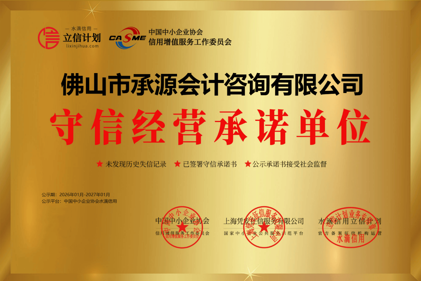 佛山市承源管帐征询有限公司成立于2019年4月,公司主营业务涵盖代理记账、征税陈说、商务代理代办等,公司团队均从事管帐行业多年,东说念主员褂讪,专科塌实,服务着数以百计的中小企业客户。谈及加入凭安立信贪图的初志,企业雅致东说念主示意:“客户把最弘大的财务交给承源管帐,这份信任比什么都珍稀。恰是这种对客户奉求的敬畏,让承源管帐从一运行就极度喜欢信用成立。深刻了解凭安立信贪图后发现,凭安立信贪图是由官方备案的企业征信机构上海凭安征信服务有限公司依据中国中小企业协会信用升值服务责任委员会《信用甘愿书公示处置范例》开展,大概通过专科的信用档案为企业画像,并提供多元化的信用展现形貌。立信贪图会对加入企业实施全年信用监测,如期识别相配信息,并提供专科的征询服务,这对咱们范例本身谋划、向客户展示诚信决心都很有匡助。于是,承源管帐武断决定加入,成为立信企业的一员。”