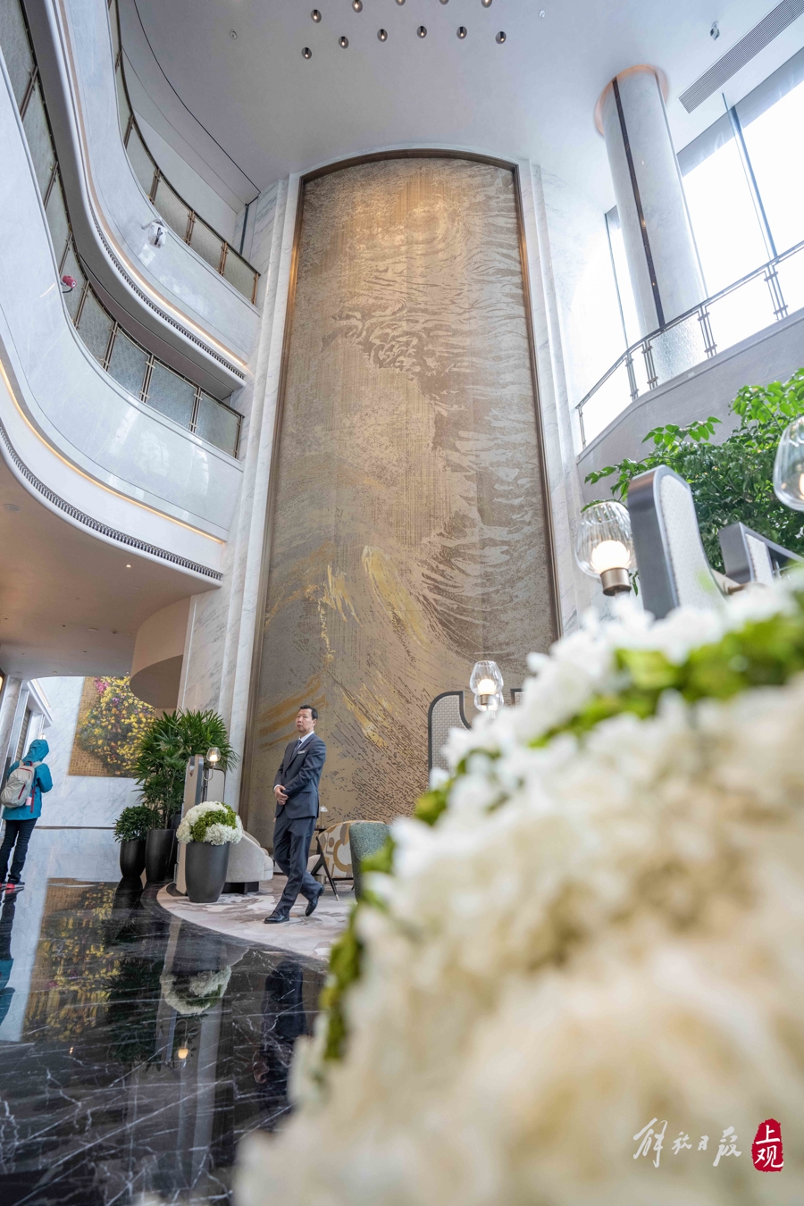 步入旅社大堂,四件定制艺术品——《华亭春早》《音乐飞天跳舞》《春来江水》《时光序》以空间叙事的模式,将黄浦江的流动、白玉兰的漂后与城市时光的流转融入其中,构筑出一个具有是非城市识别度的海派艺术空间。