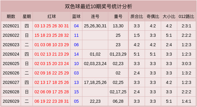 福彩双色球近10期奖号数据统计表