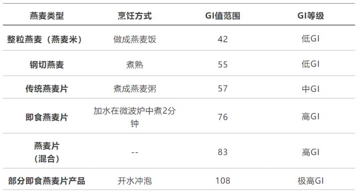 不同燕麦口头的升糖指数(GI)对比